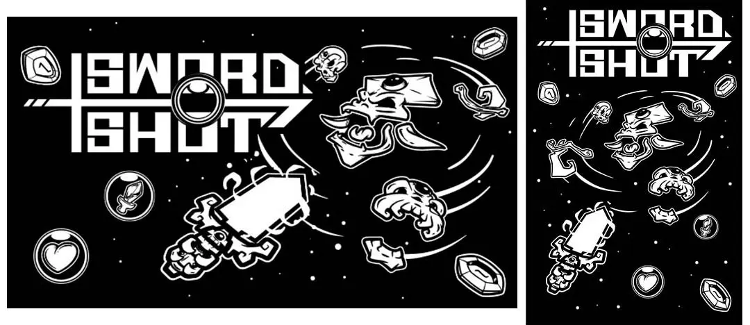 Sword Shot is a black & white shooter where the goal is to shoot through a series of spinning objects in an attempt to kill the enemy at the center of those objects. It’s difficult as all get-out, but it’s a frustratingly good time. The simplicity of the graphics allowed me some freedom in the overall design of the banner, as I got to interpret slightly more detailed versions of the sprites. I also got to create the logo for this one as well.