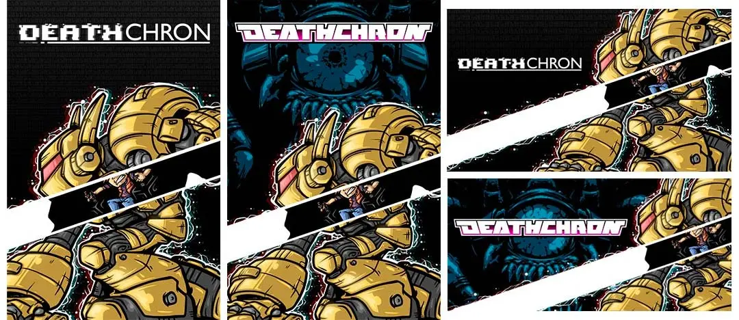 Words cannot express how genuinely excited I was for this game, and even more excited that I got to make the artwork for the banners. Deathchron is basically a mech version of Master Blaster. You’re a kid who has control of this giant robot, and you run and gun through all kinds of glorious pixel carnage. You can also exit the mech a la Master Blaster to perform exploratory tasks. For the artwork, I chose to use a streak of x-ray light going through the mech to reveal the boy controlling it from the inside. The boy’s t-shirt and chair design are homages to one of my favorite movies, Flight of the Navigator.