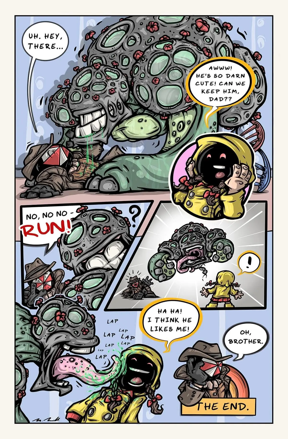 Following this one-pager, TUG asked me if I'd be up for illustrating an ashcan comic to accompany his current campaign (at the time), Another Case for the Littlest Umbrella. I had just been offered Eric Weather's Battle Brick Road ashcan earlier that year, but always the glutton for stressful amounts of work, I happily accepted.