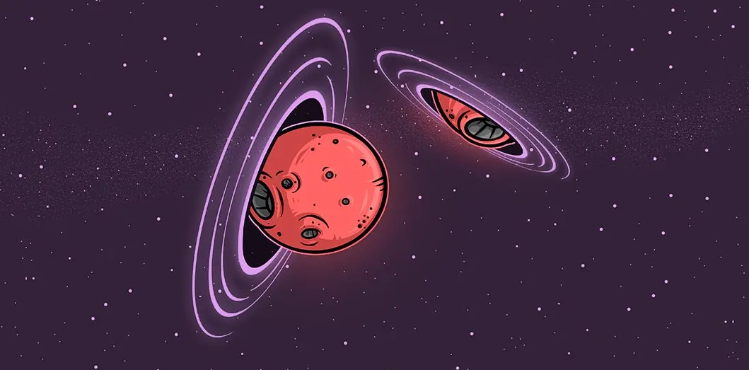 A giant parasitic planet that is seemingly feeding upon the remains of another alien world. It's fairly safe to assume that there is nothing non-hostile about this world. The inhabitants are comprised of giant single-celled organisms and a large assortment of corpses that are little more than puppets for said organisms.